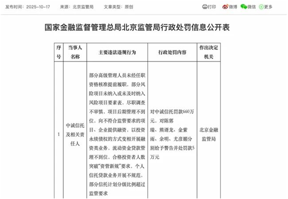 2025年10月17日,国家金融监督管理总局北京监管局的一纸罚单,将中诚信托有限责任公司(下称“中诚信托”)推向舆论焦点。