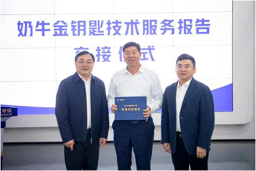 国家奶牛产业技术体系首席科学家、中国农业大学教授李胜利,蒙牛集团副总裁温永平向牧场负责人移交《技术服务报告》