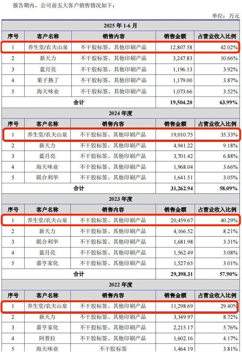 然而,光鲜业绩背后暗藏隐忧,典型的大客户依赖症成为制约公司发展的核心风险。这种依赖在与农夫山泉的合作中表现得尤为明显:2023年,东方树叶销售额同比暴涨83.30%,江天科技承接的对应销售额同步增长82.98%,精准承接了下游爆发式需求的红利;但到了2024年,尽管东方树叶销售额仍保持32.27%的同比高增,江天科技对农夫山泉的收入却微降2.85%,公司在招股书中明确解释,核心原因是标签产品销售价格下调,凸显出面对核心大客户时议价能力的被动。