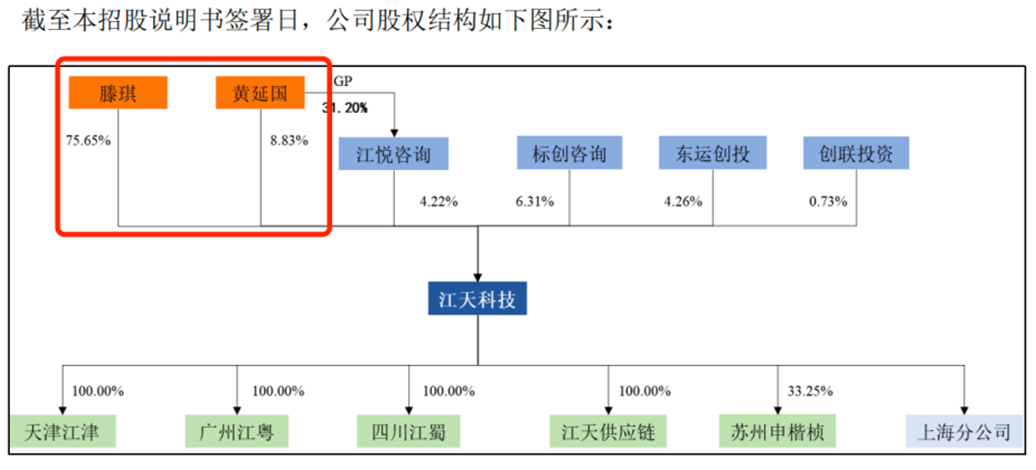 2014年,江天有限迎来二代传承,王金华、滕士元夫妇将所持全部股权转让给女儿滕琪与女婿黄延国,二人随后全面接管公司经营;2021年,江天有限完成股份制改革,正式更名为苏州江天包装科技股份有限公司。截至招股书签署日,滕琪(任董事长)与黄延国(任董事、总经理)通过直接及间接持股,合计控制公司88.70%的表决权,股权架构高度集中。