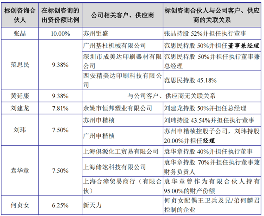 股东层面,第三大股东苏州市标创企业管理咨询合伙企业(有限合伙)(下称“标创咨询”)持有江天科技6.31%股份,该合伙企业于2020年12月22日成立,仅两天后便完成对江天科技的入股,合伙人阵容涵盖16名关联方,包括公司客户、供应商及实控人家属。其中,苏州钜盛(张喆持股52%并任执行董事)、恒邦塑业(刘建龙持股50%)为江天科技客户;广州基杜机械(范思民持股50%并任董事兼经理)、苏州申楷桢(刘玮持股43.54%)为公司供应商;同时,黄延国的兄弟黄延康、侄子黄吉权也通过标创咨询间接持有江天科技股份。