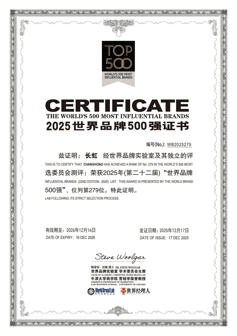 12月17日,世界品牌实验室(World Brand Lab)揭晓了2025年度(第二十二届)《世界品牌500强》榜单,在这份汇聚全球顶尖品牌的权威榜单中,中国上榜品牌数量已达50个,稳居全球第三。其中,长虹位列第279位,较2024年跃升4位。