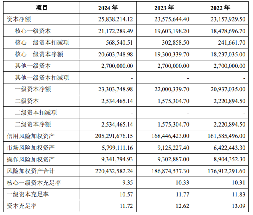 除此以外,作为衡量银行风险抵御能力的核心指标——资本充足率,重庆三峡银行近年来呈现持续下滑的态势。公开数据显示,2022年,该行资本充足率、一级资本充足率及核心一级资本充足率分别为13.09%、11.83%、10.31%。但是截至2025年三季度末,该行资本充足率为11.45%,一级资本充足率为10.43%,核心一级资本充足率为8.46%。重庆三峡银行这三项关键指标均呈现不同程度的下滑。监管要求,中国商业银行资本充足率的最低监管标准为?10.50%?,一级资本充足率?的最低监管标准为?8.50%,?核心一级资本充足率?的最低监管标准为?7.50%。