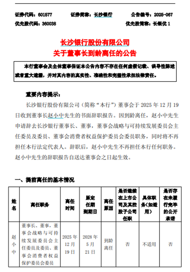 一个值得深究的细节是:赵小中刚连任第八届董事会董事长不久,原定任期为2028年5月21日,此时此刻因为年龄因素整整提前了两年半。这种“先连任再提前退”的非常规操作,在上市银行中极为罕见。