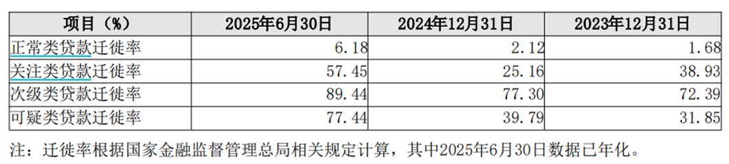 此外,关注类贷款迁徙率从2024年末的25.16%猛增至2025年上半年的57.45%,涨幅超一倍;次级类贷款迁徙率更达89.44%。这意味着长沙银行未来不良率面临持续上行压力。