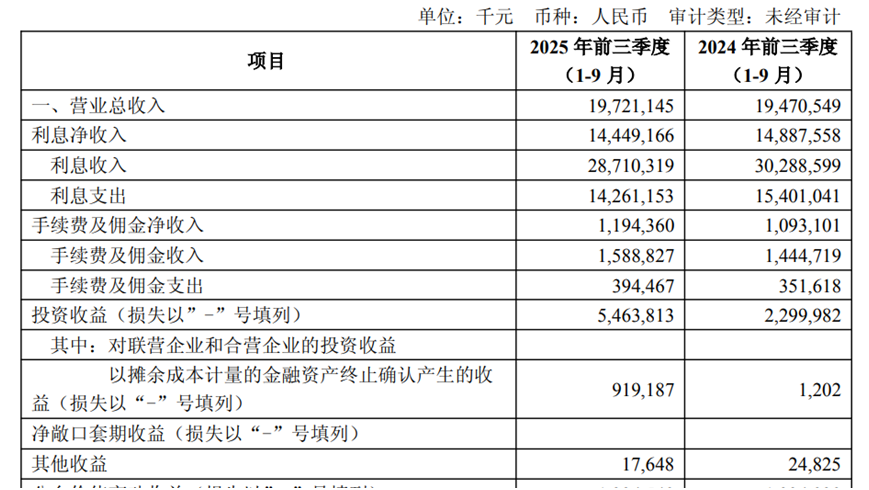 值得注意的是,长沙银行2025年三季报显示,利息净收入同比下降2.9%,至144.49亿元;非利息收入同比增长15.03%,其中手续费及佣金收入11.94亿元,同比增长9.26%,投资净收益54.64亿元,同比增长137.57%。这表明,银行利润增长靠投资收益补位,利息收入增长疲软。
