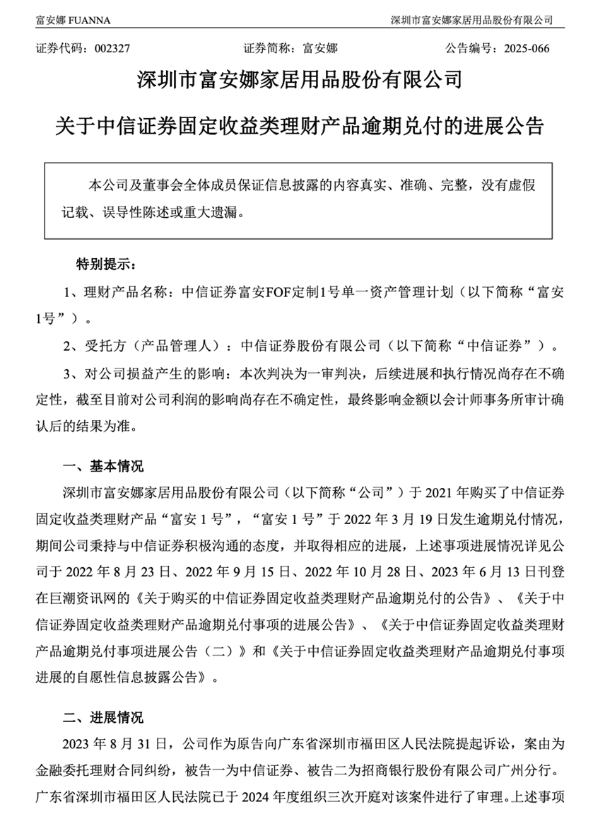 2025年末,家纺龙头富安娜(002327.SZ)与“券业一哥”中信证券的三年理财拉锯战迎来阶段性终章。