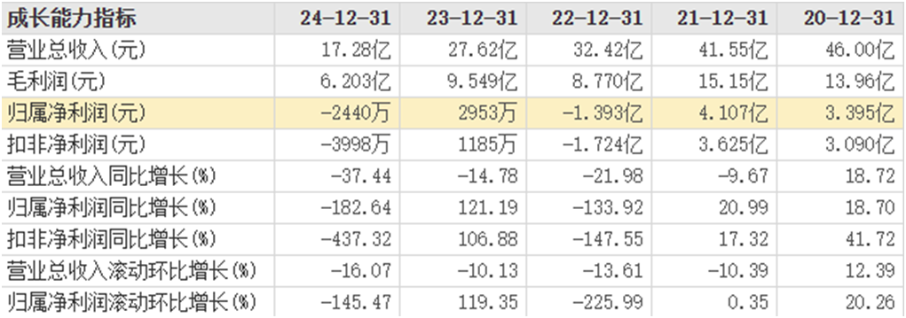 进入2024年,经营压力进一步加剧。全年营收仅17.28亿元,同比大幅下滑37.44%,较2020年高点缩水超过六成;归母净利润亏损2440.03万元,同比下降182.64%,扣非净利润亏损3998.33万元,同比降幅高达437.32%,盈利能力持续处于深度承压状态。