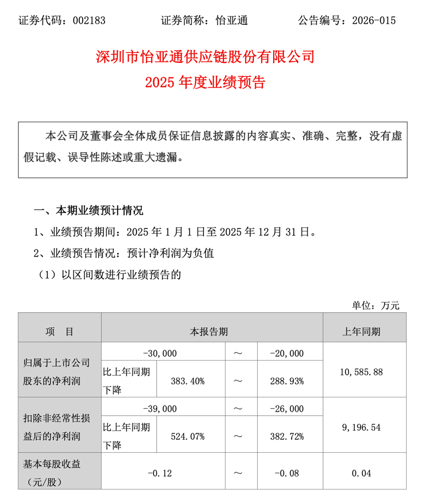 怡亚通这家国内供应链第一股,正迎来其发展历程中的关键时刻。2026年1月30日,怡亚通披露的2025年度业绩预告显示,预计全年归属于上市公司股东的净利润为亏损2亿元至3亿元,同比骤降288.93%~383.40%。