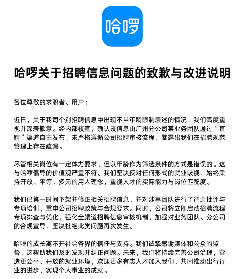 3月3日,针对此次因招聘信息引发的争议,哈啰发布致歉声明。对于个别招聘信息中出现不当年龄限制表述,哈啰深表歉意,并明确表示以年龄作为筛选条件的方式是错误的。