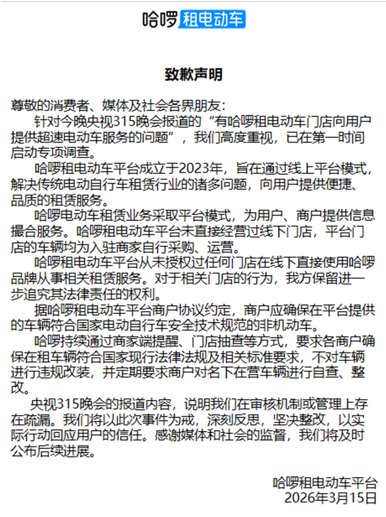 事件曝光当日,哈啰租电动车发布致歉声明,称已启动专项调查并开展自查整改。哈啰方面表示,公司未直接运营线下门店,平台门店车辆由入驻商家自行采购运营,未授权门店线下使用哈啰品牌开展租赁业务,将对涉事门店保留法律追责权利。