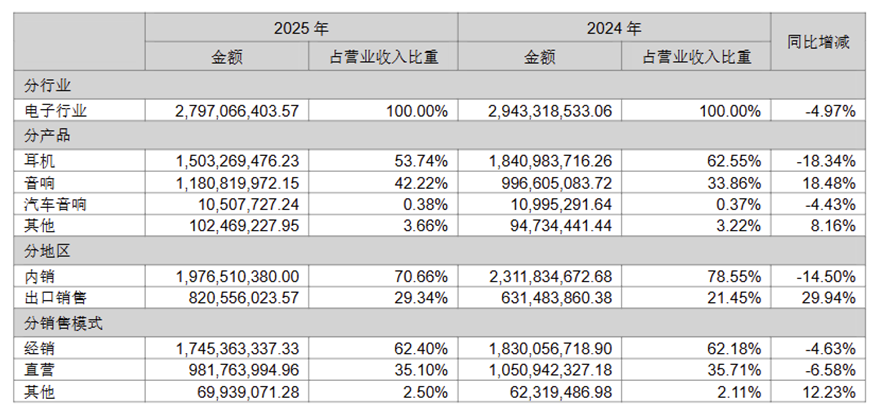 从业务结构来看,漫步者2025年呈现出明显的结构性失衡特征:核心耳机业务大幅下滑,音响业务独木难支,内销市场持续萎缩,增长结构极度脆弱。