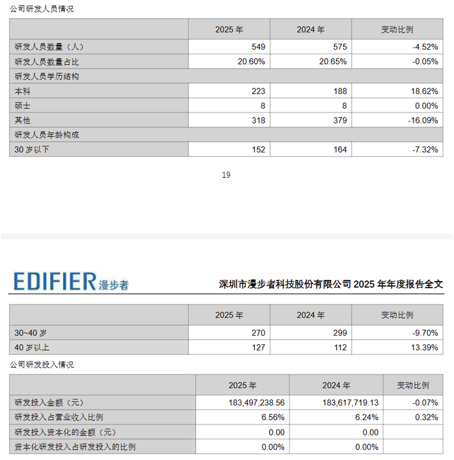 在业绩与业务结构承压之外,漫步者的研发投入布局呈现出与行业发展节奏不匹配的态势,成为制约其长期发展的核心因素。