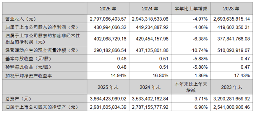 年报数据显示,公司2025年实现营业总收入27.97亿元,同比下降4.97%;实现归母净利润4.31亿元,同比下降4.06%;扣除非经常性损益后的净利润4.02亿元,同比下降6.38%。营收、净利、扣非净利三项核心指标同步下滑,意味着公司主营业务增长动能持续衰减,盈利基础并不稳固。