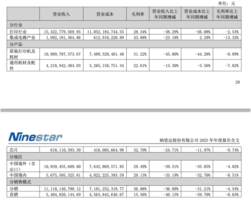 纳思达营收与利润的大幅下滑,并非单一业务板块波动所致,而是覆盖打印、集成电路两大核心领域的全面收缩,其中传统打印主业成为最大拖累,细分产品均出现不同程度下滑。