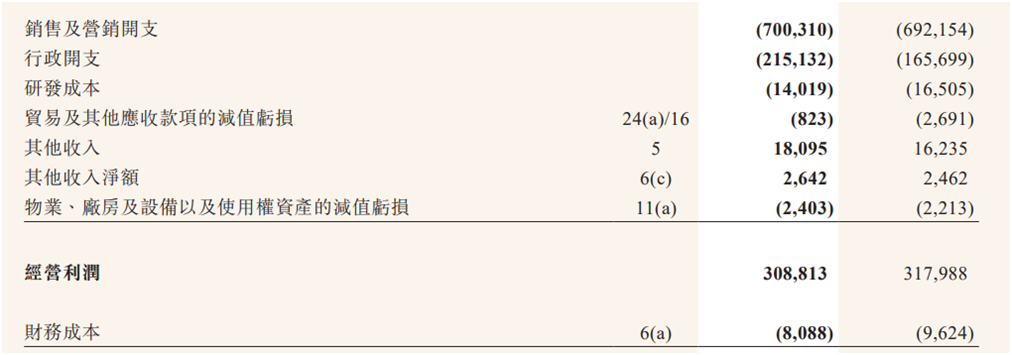 但毛利率的增长红利,被持续加大的费用压力所吞噬。2025年,公司销售及营销开支7.00亿元,同比增长1.2%,其中广告及宣传开支增至3.03亿元,同比增长9.8%,主要用于品牌推广、线下活动及数字化营销;行政管理开支2.15亿元,同比大幅增长29.8%,核心原因是产生了与全球发售相关的上市费用,以及第三方战略咨询服务费用增加;财务成本808.8万元,同比下降15.6%,主要得益于租赁负债利息减少。