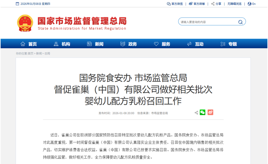 消息一出,迅速引发市场广泛关注,中国监管层更是第一时间作出响应——国务院食安办、市场监管总局当即对该事件高度重视,同步督促雀巢(中国)有限公司严格履行企业主体责任,全面召回在境内市场流通的相关批次问题产品,以切实保障消费者合法权益与身体健康。