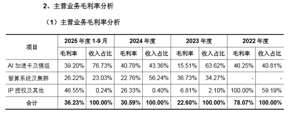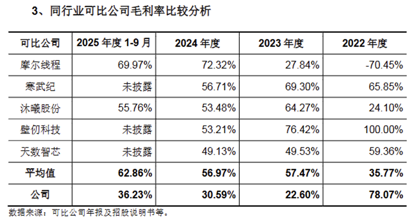 盈利能力薄弱,还体现在偏低的毛利率上。2025年前三季度,公司主营业务毛利率仅36%左右,显著低于国内同类上市企业,反映出产品定价权较弱、成本控制能力不足。为了打开市场,燧原科技在销售端采取以价换量策略,直接压缩了利润空间。