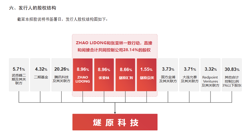其次,从股权结构来看,燧原科技呈现出多元股东共治的特点。创始团队赵立东、张亚林作为一致行动人,直接和间接合计控制公司28.14%的股权。腾讯作为第一大机构股东,持股20.26%并派驻董事参与战略决策。