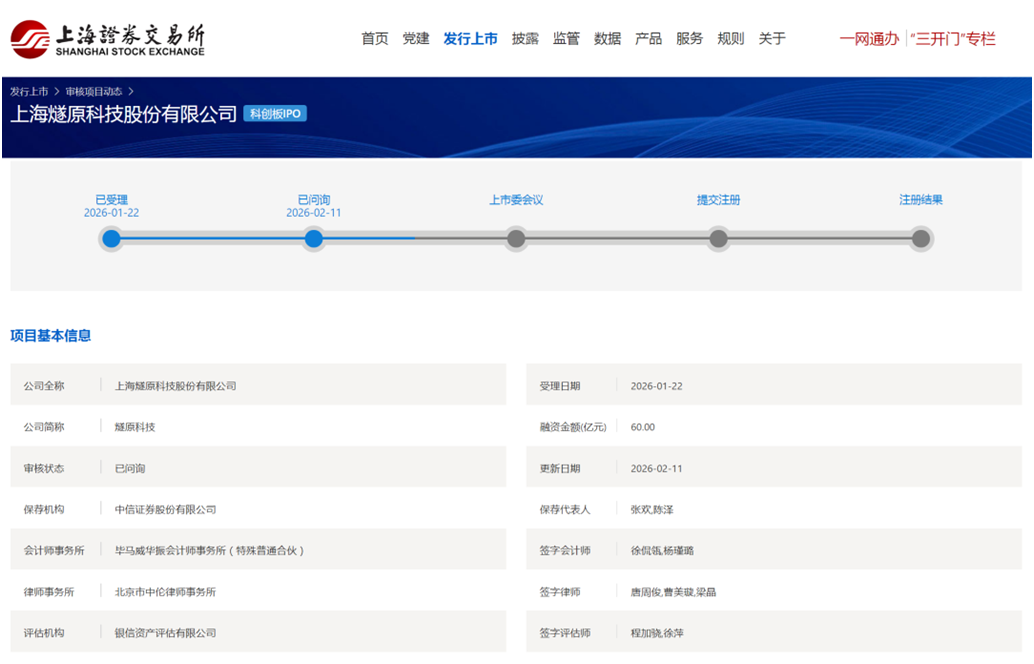 2月11日,上交所官网显示,上海燧原科技股份有限公司(以下简称“燧原科技”)科创板IPO审核状态变更为“已问询”。