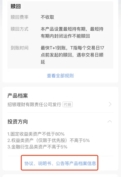底层资产投向会显示在产品说明书里。在产品详情页面,滑过收益展示、申购赎回规则这些内容,继续往下找,通常会有一个叫“产品说明书”或“产品公告”的地方,点开它就能找到“产品说明书”。