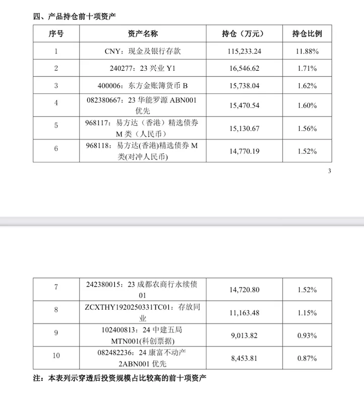 如果你觉得光知道“80%投固收、20%投权益”还不够具体,想知道那80%的固收里到底买了哪家公司的哪种债券?那20%的权益又具体买了哪只股票或基金?这个信息也是可以查到的,但通常要等产品运作一段时间之后。