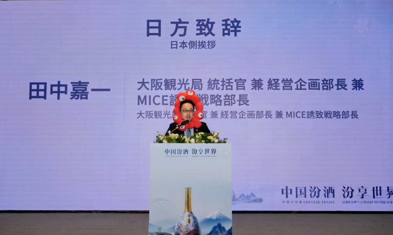 山西杏花村汾酒国际贸易有限责任公司相关负责人,回顾了汾酒跨越六千年的酿造史与百年品牌辉煌,并阐述了汾酒借力大阪世博会这一国际平台,走向世界、深化文化交流的决心。大阪观光局统括官田中嘉一先生则在致辞中盛赞汾酒作为文化使者的角色,其融入世博舞台具有重要意义,更促进了日中乃至全球范围内的友好往来与文明互鉴,期待以酒为媒,深化两国人文与经济合作。