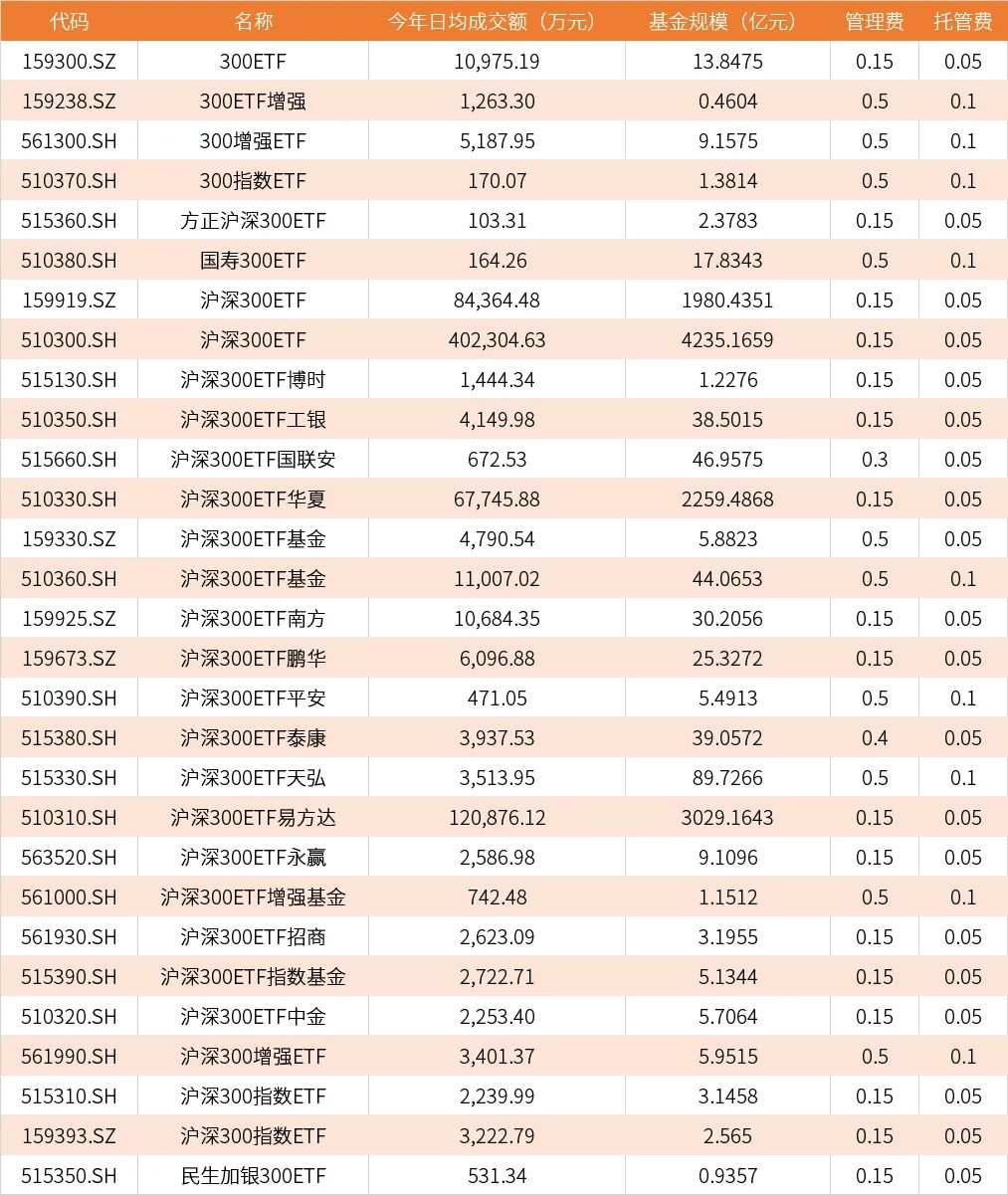 除了规模外,费率也是选择指数基金时不可忽略的一环。各家基金公司发行的同类指数基金,还看追踪沪深 300 指数的ETF,本质上都是按照同一套指数标准进行复制,理论上其最终的收益率差异不大。