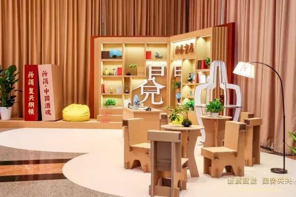论坛现场,两大互动体验区成为全场焦点,生动诠释了汾酒对绿色可持续发展的深度践行。体验区采用全纸竖瓦楞材料搭建,从材质到空间设计都贯穿环保再利用理念,让嘉宾直观感受“绿色汾酒”的实践担当。