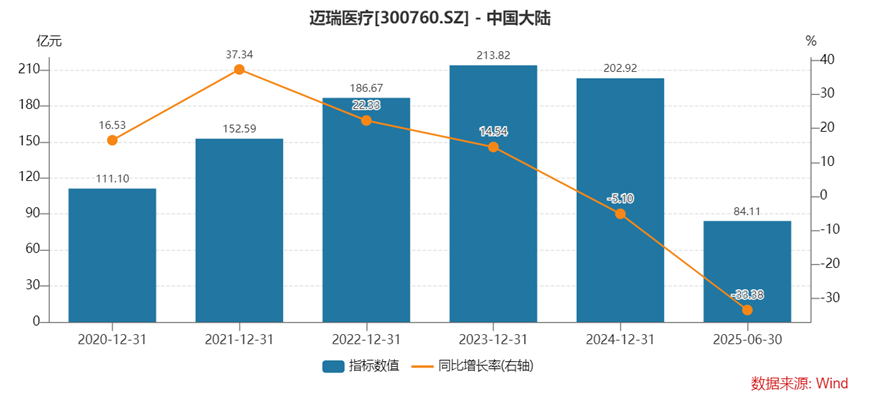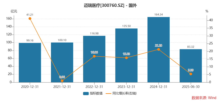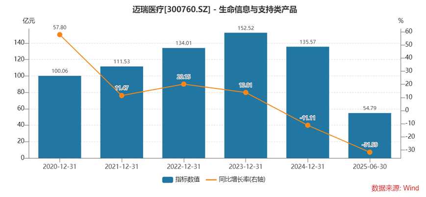 生命信息与支持业务:作为公司传统的业绩支柱,2025年上半年收入54.79亿元,同比骤降31.59%。该业务领域的监护仪、呼吸机、除颤仪、麻醉机等核心产品受国内医疗基建项目延期拖累。值得注意的是,该业务2017年到2023年复合增长率近20%,此次大幅下滑标志着公司核心增长动力的失速。
