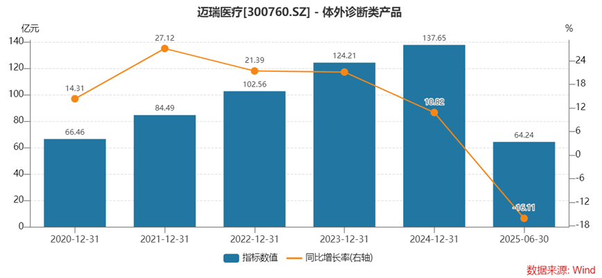 体外诊断(IVD)业务:在2024年刚成为公司第一大业务,2025年上半年收入64.24亿元,同比下降16.11%。主要原因是体外诊断试剂的检测量和价格均出现了一定幅度的下滑,导致体外诊断业务遭遇阶段性挑战。尤其是在2025年第三季度,体外诊断产线整体实现收入36.34亿元,同比下降2.81%,而国内市场成为主要拖累。