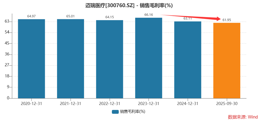 迈瑞医疗的超低价中标并非偶然,而是其精心设计的“设备+试剂”绑定销售模式的体现。在这种模式下,企业以极低价格甚至免费提供医疗设备,然后通过后续的试剂、耗材销售和服务来获取持续收入。这种模式虽然在一定程度上能够保证客户的长期粘性,但也可能导致市场秩序的混乱。从实际效果来看,低价竞标策略已经对迈瑞医疗的盈利能力产生了实质性侵蚀。2025年三季度,公司整体毛利率降至61.95%,较往年明显下滑。