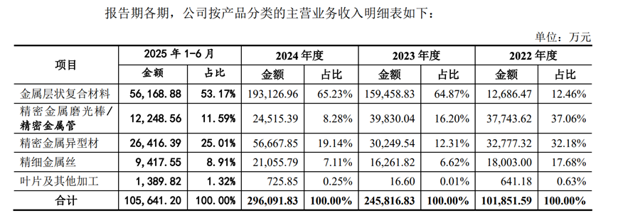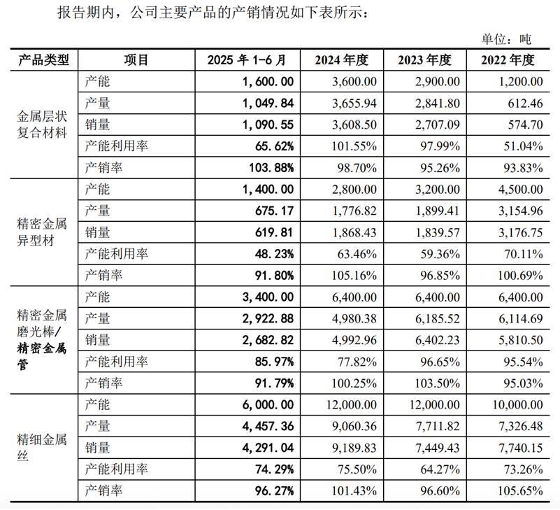 更值得警惕的是,公司在招股书中直言,受终端客户钛合金边框机型调整影响,2025年上半年,核心的钛-铝复合材料收入仅为5.62亿元,占比回落至53.17%,毛利率同步承压下滑,核心产品的收入规模与盈利能力双降。随之而来的是产能利用率的断崖式下跌,从2024年的超负荷生产跌至2025年上半年的65.62%,产能闲置的背后,是库存的持续积压与产品价格的被动下行。