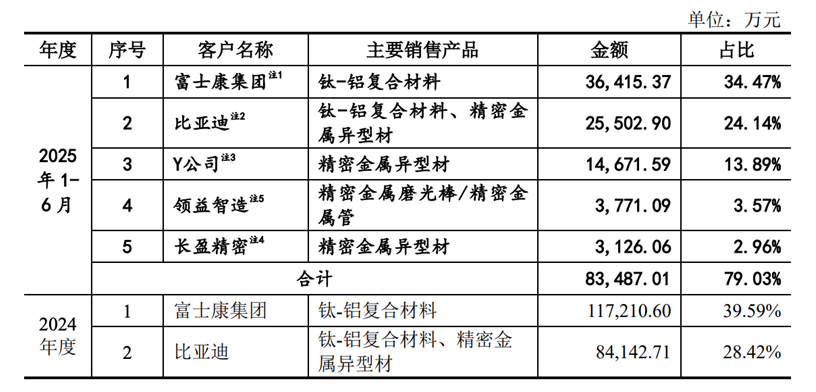 康瑞新材的业绩增长高度绑定消费电子巨头,招股书显示。2022年至2024年,公司来自前五大客户的收入占比分别为61.39%、84.63%、84.77%,2025年上半年这一比例仍达79.03%;其中富士康集团2024年营收占比39.59%,比亚迪收购捷普相关业务后,2024年成为公司第二大客户,营收占比28.42%。