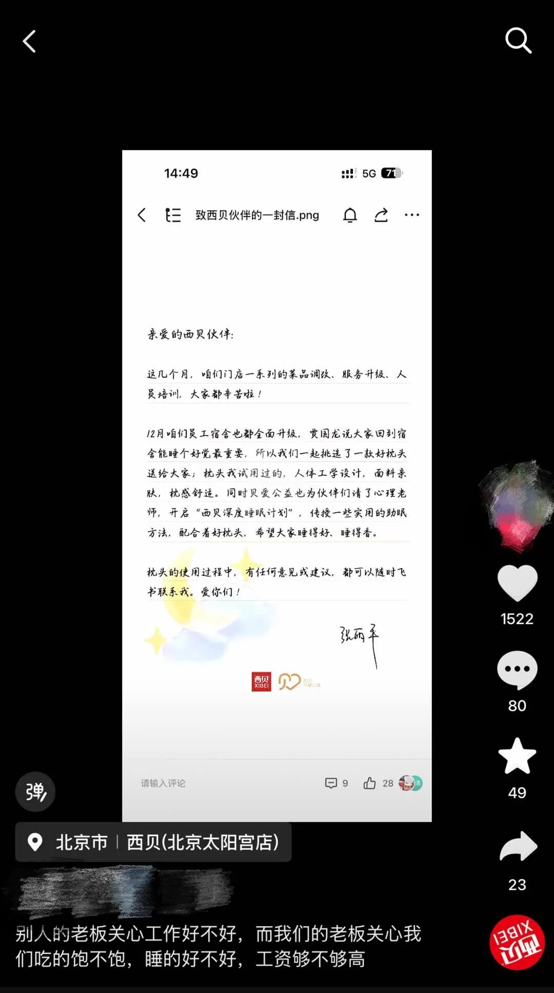 同时,信中表示“西贝为伙伴们请了心理老师,开启“西贝深度睡眠计划”,传授一些实用的助眠方法,配合着好枕头,希望大家睡得好、睡得香。”