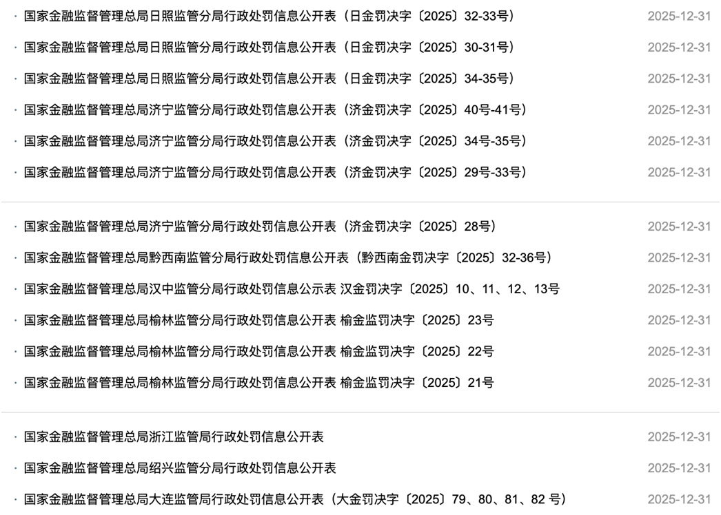 2025年12月31日,国家金融监督管理总局披露了15张罚单,被罚机构包括青岛银行、邮储银行、中信银行、青岛银行、恒丰银行、华夏银行、太平财险、前海保险、平安人寿、瑞众人寿、中意人寿、阳光人寿等多家金融机构。
