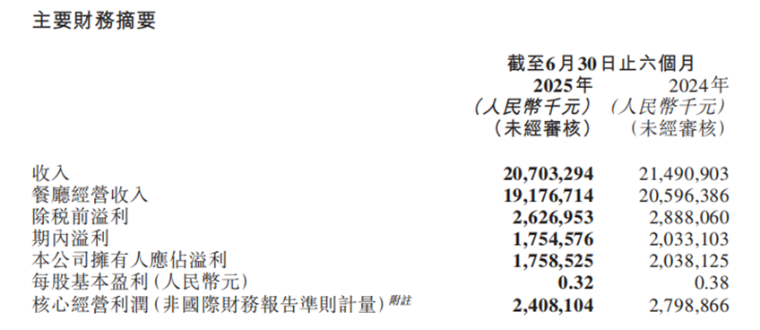 营收与利润的增长动能明显不足。2025年上半年,海底捞实现营收207.03亿元,同比下降3.7%;核心经营利润24.08亿元,同比下降14.0%;股东应占溢利17.59亿元,同比下降13.7%。这是继2022年亏损后,海底捞再次出现连续两个季度的利润下滑。