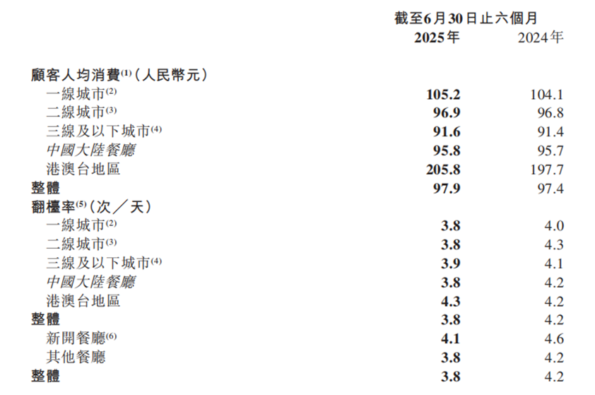 2025年上半年,海底捞餐厅接待人数1.898亿人次,同比下降4.2%,人均消费97.9元,较上年同期仅增长1.1%,增长乏力的客流与近乎停滞的客单价,共同制约了营收增长。
