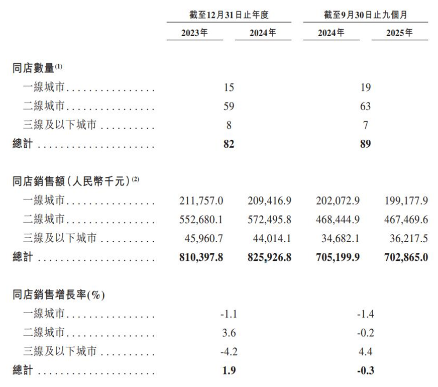 值得注意的是,公司的同店销售额及同店销售增长率在往绩记录期内呈现波动甚至下滑态势。2025年前九个月,同店销售额较去年同期出现了0.3%的负增长。分城市层级看,一线城市的同店销售增长率在2024年和2025年前九个月均处于负值区间。