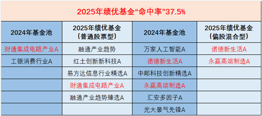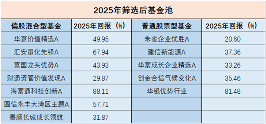 如此严苛条件下,有财通集成电路产业A和工银消费行业A2只基金从569只普通股票型基金主代码基金中完美通过4层滤网,其中财通集成电路产业A进入2025年全市场业绩回报前100;万家人工智能A、诺德新生活A、中邮科技创新精选A、永赢高端制造A、汇安多因子A、光大景气先锋A这6只偏股混合型基金进入基金池,其中诺德新生活A和永赢高端制造A上榜前100,命中率37.5%。而那些未上榜的5只基金2025年平均回报30.14%,最高41.04%、最低15.28%。