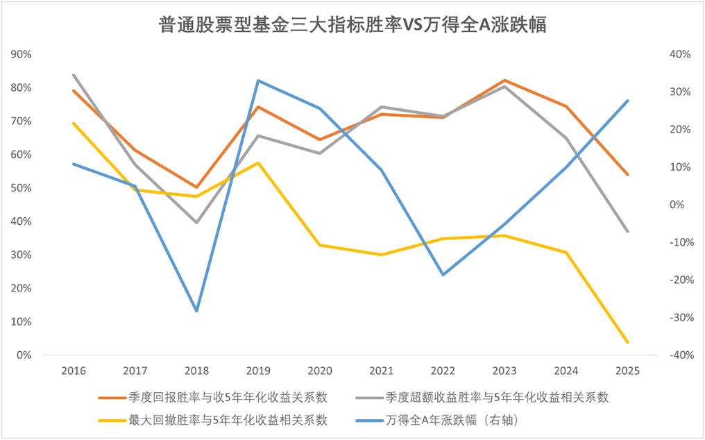 万得数据显示,截至2025年年末,成立满3年的569只万得普通股票型基金成分主代码基金,滚动过去5年的单季度业绩回报基本上是与市场(万得全A当期涨跌幅)亦步亦趋,但季度业绩胜率及胜率相关系数(相对于5年年化收益率)与当年度的行情变化关系不大,在市场情绪极端高涨年份(如2019、2020)胜率反而偏低,在市场情绪低迷但非恐慌年份(如2023、2024)胜率较高。