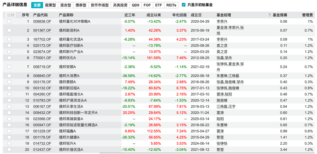 德邦基金的困境还远不止于此。截至2026年2月3日,wind数据显示,德邦基金旗下有17只基金产品的基金规模低于1亿元,其中12只基金产品的基金规模低于5000万元(清盘线)。举例来看,德邦量化对冲策略A、德邦新添利A、德邦量化优选A的基金规模分别为0.06亿元、0.07亿元、0.09亿元,这三只基金的基金规模甚至不足1000万元。