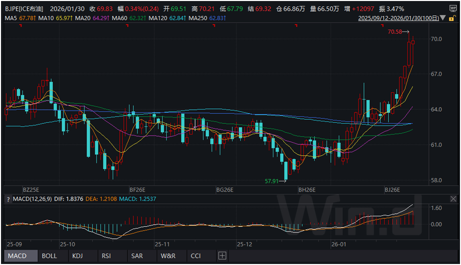 从过往言论主张来看,凯文·沃什的“降息缩表”的本质含义是,压缩民间资产负债表,修复政府资产负债表。美国政府部门想要以低融资利率化债,代价就是收缩民间债务。由于近几年美国已经成为世界头号产油国,同时中东国家出口石油获得的美元也将用于购买美国国债,因此在接下来石油的价格越高,产油国将有更多的钱去购买美债。考虑到特朗普及共和党执政,将会欢迎提高油价以压制美债利率从而解决债务问题的路径。资本市场对此的反应同样也是,ICE布油的价格在1月29日涨过了70美元。(见图2)