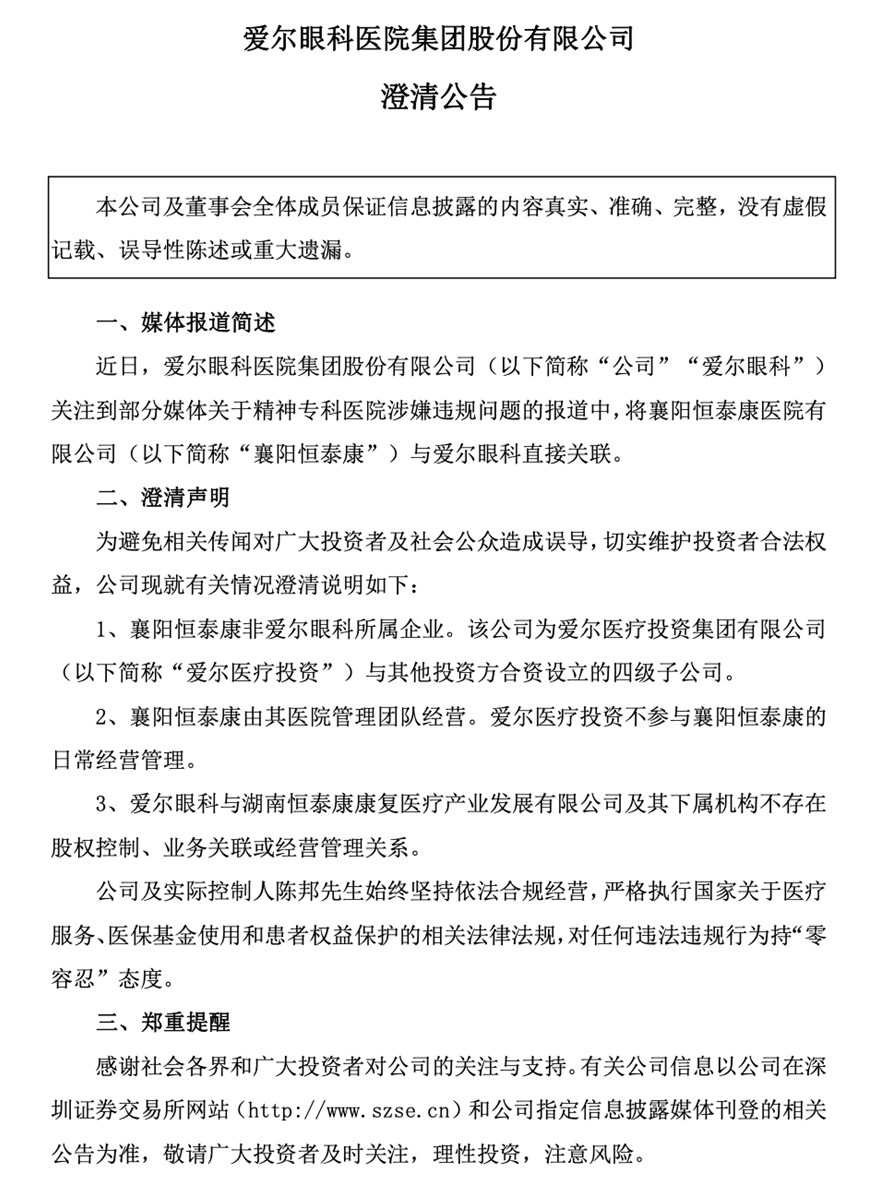 面对骗保风波,爱尔眼科的回应迅速而果断。公司发布公告称,襄阳恒泰康医院为爱尔医疗投资集团有限公司(以下简称“爱尔医疗投资”)与其他投资方合资设立的四级子公司。