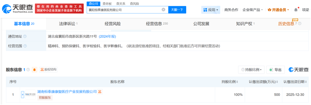 天眼查公开信息显示,襄阳恒泰康医院由湖南恒泰康康复医疗产业发展有限公司全资控股。股权穿透后可见,湖南恒泰康的间接控股股东为爱尔医疗投资集团有限公司。