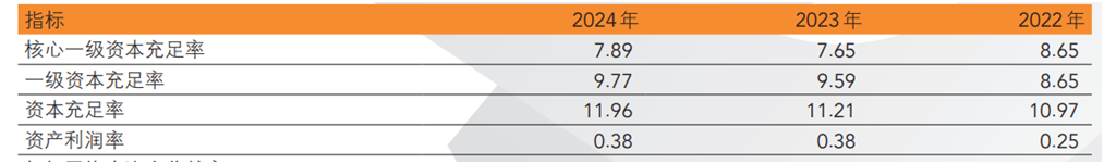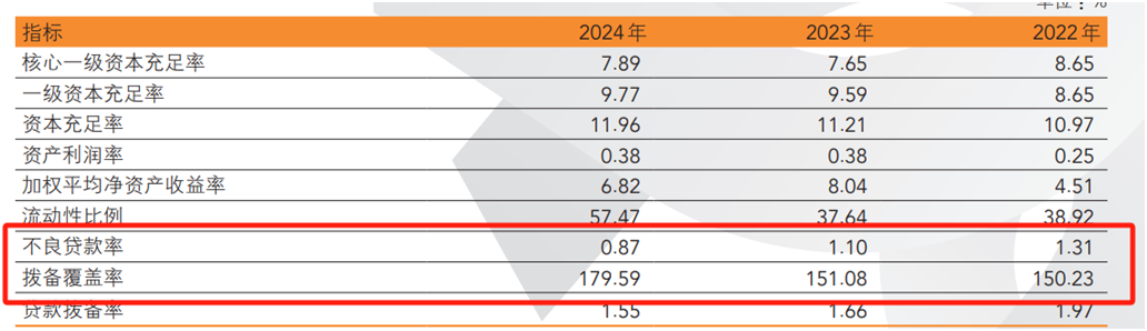 2024年末,得益于不良资产处置力度加大,该行不良贷款率进一步优化至0.87%,低于全国商业银行平均水平(2024年末全国商业银行整体不良贷款率为1.5%);不过,该行拨备覆盖率虽然升至179.59%,但较行业平均水平(2024年末全国商业银行整体拨备覆盖率为211.19%)差距明显。