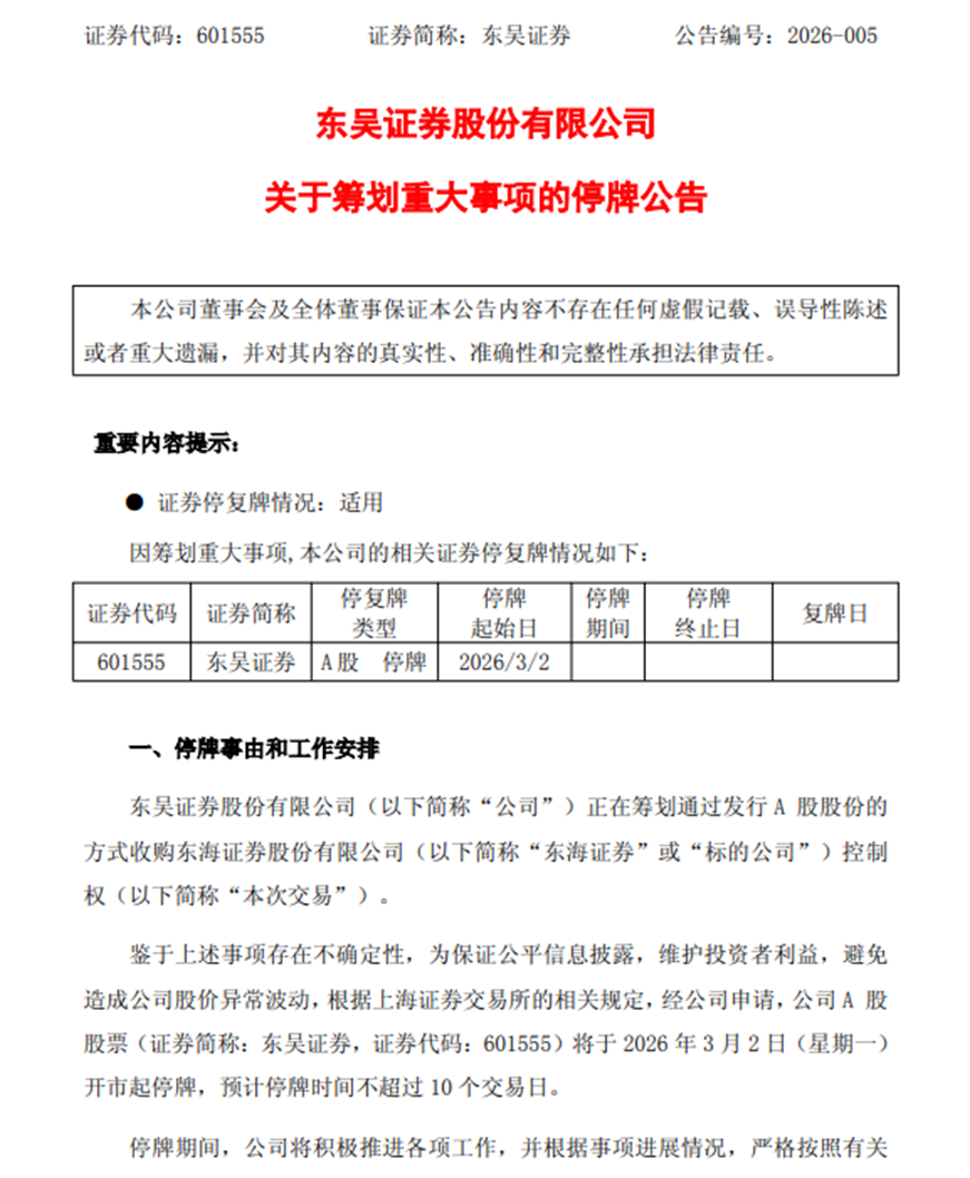 2026年开年,证券行业迎来重磅并购消息——3月2日盘前,东吴证券(601555.SH)突发公告,宣布正筹划通过发行A股股份的方式,收购常州投资集团有限公司(以下简称“常投集团”)所持有的东海证券26.68%股权,以此获得东海证券控制权,公司股票自当日起停牌,预计停牌时间不超过10个交易日。