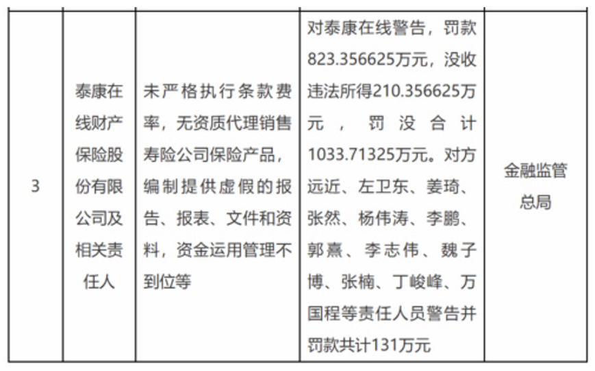 2025年2月,泰康在线因未严格执行条款费率、无资质代理销售寿险产品、编制提供虚假报告报表、资金运用管理不到位等问题,被处以823.36万元罚款及210万元违法所得没收,罚没总额1033.7万元,12名责任人合计被罚131万元。除了泰康在线收到的千万级罚单,大地财险、紫金财险等多家财险机构被罚超百万元,违规行为主要集中在财务数据造假、虚构中介业务套费等方面。