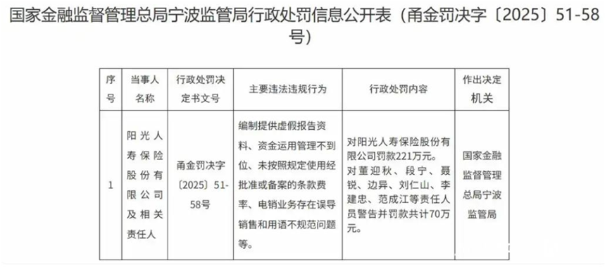 其违规行为贯穿业务核心环节,并且部门层级跨度大。从基层分支机构的销售误导、佣金违规,到总部层面的虚假报告、资金运用失范,甚至多名高管牵涉其中。2026年1月,阳光人寿江西分公司因未如实记录保险业务事项、员工虚假理赔,被罚款31万元,责任人蒲杨被处以15年禁业的严厉处罚;2025年8月,阳光人寿总部因编制虚假报告资料、资金运用管理不到位、电销业务误导销售等多项违规,被罚款221万元,包括集团合规负责人在内的7名高管被警告并合计罚款70万元。