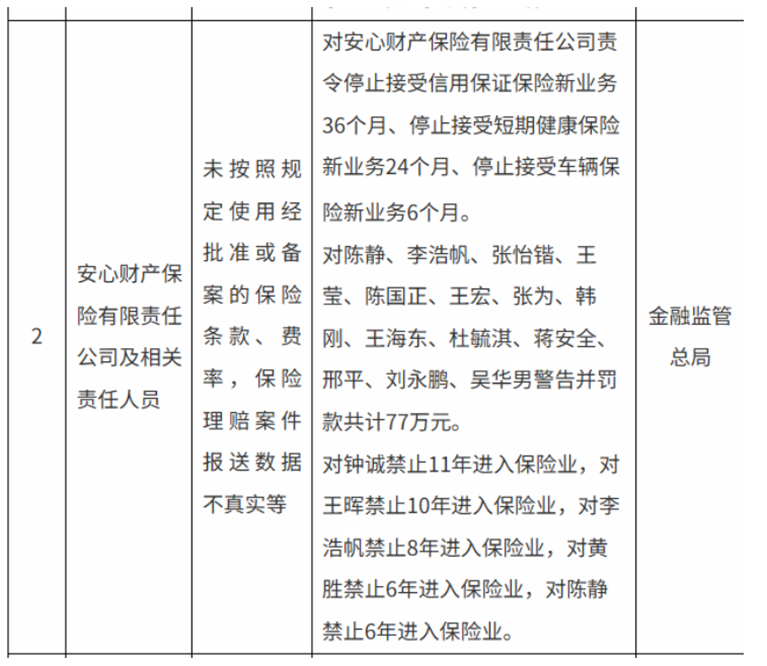 2025年10月,金融监管总局发布《关于加强非车险业务监管有关事项的通知》,明确非车险“报行合一”要求。但全年罚单显示,多家险企因“报行不合一”受罚。2025年4月,华安财险广东分公司因未按照规定使用经备案的保险费率被罚没23.59万元,番禺支公司因虚列劳务费、虚构保险中介业务被罚30万元;2025年12月,安心财险因未按照规定使用经批准或备案的保险条款费率及理赔案件报送数据不真实,被停止接受信用保证保险新业务36个月、停止接受短期健康保险新业务24个月、停止接受车辆保险新业务6个月,14名责任人被警告并罚款共计77万元,5名责任人被禁止6至11年进入保险业。